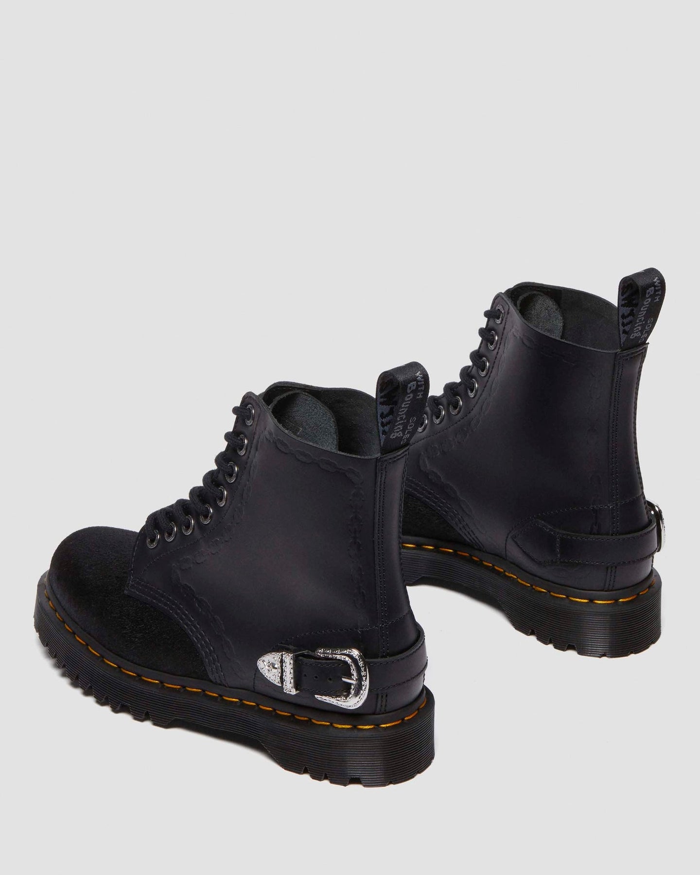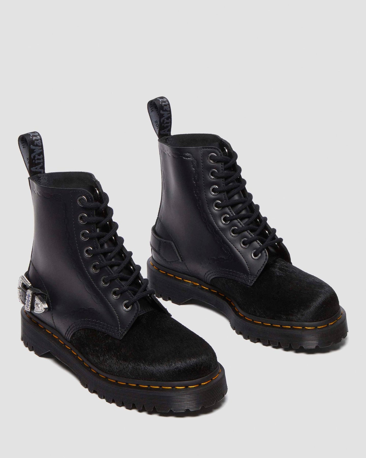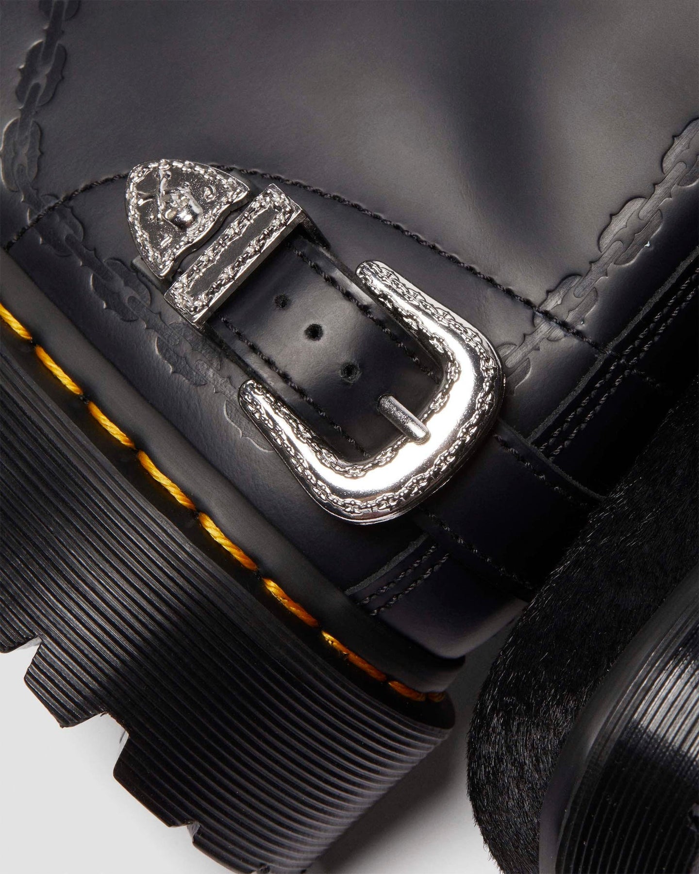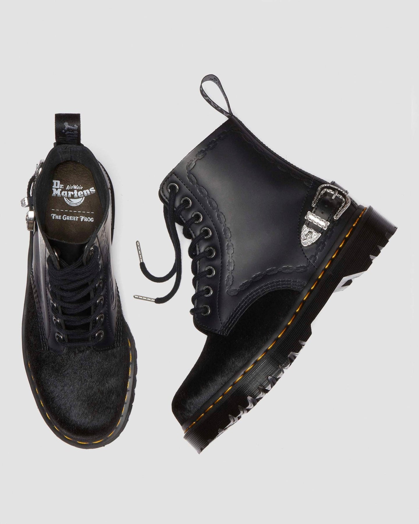 Our second collaboration with London jeweller The Great Frog includes this reworked version of our classic 1460 boot. Made from black Smooth leather with a Hair On vamp, with hardware engraved by TGF Creative Director Reino Lehtonen-Riley. The leather is detailed with debossed chain artwork, which also forms the border of the vintage-inspired silver buckle on the boot’s heel. Other silver details include metal aglets and TGF-branded eyelets. The elevated Bex sole is secured with classic DM’s yellow welt stitching, while our heel loop is signed with a charcoal script.