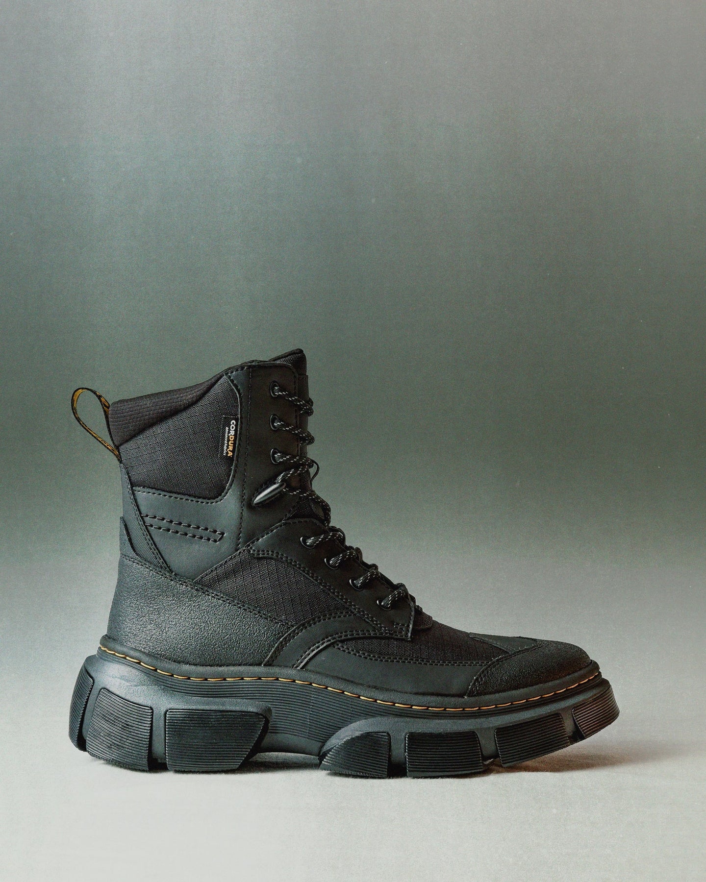 The DMXL Utility Boots are a reworked version of Dr. Martens' universal design and heritage. The upper is a hybrid of robust leather, finely patterned split leather and polyester materials, and is made with an emphasis on being practical as well as fashionable. The lightweight outsole features grooved sidewalls and a sawtooth bottom design. The light and durable outsole is connected by yellow stitching on the welt. The reconstructed design inherits the DNA of the original 1460 8-Hole Boots, which was born in 1960, but with a more contemporary feel. The modern and industrial silhouette is a tribute to fashion and design.