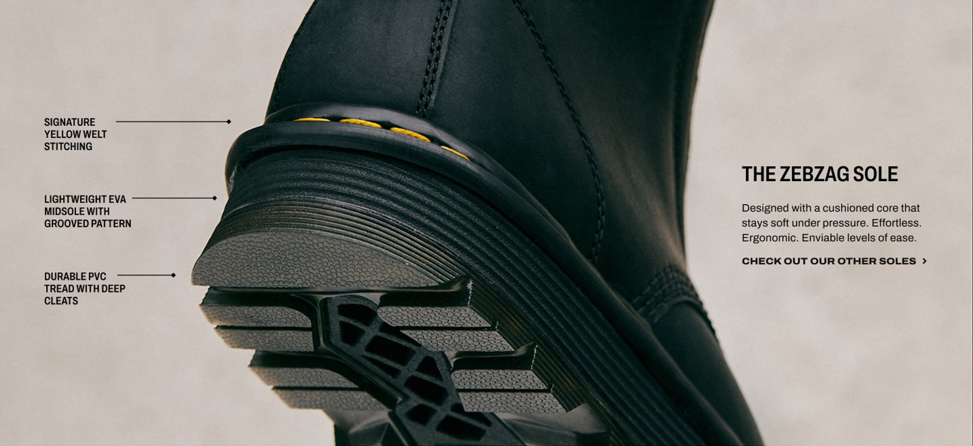 Feet first. Worries last. The Zebzag sole aobsorbs stress, so you don't have to.