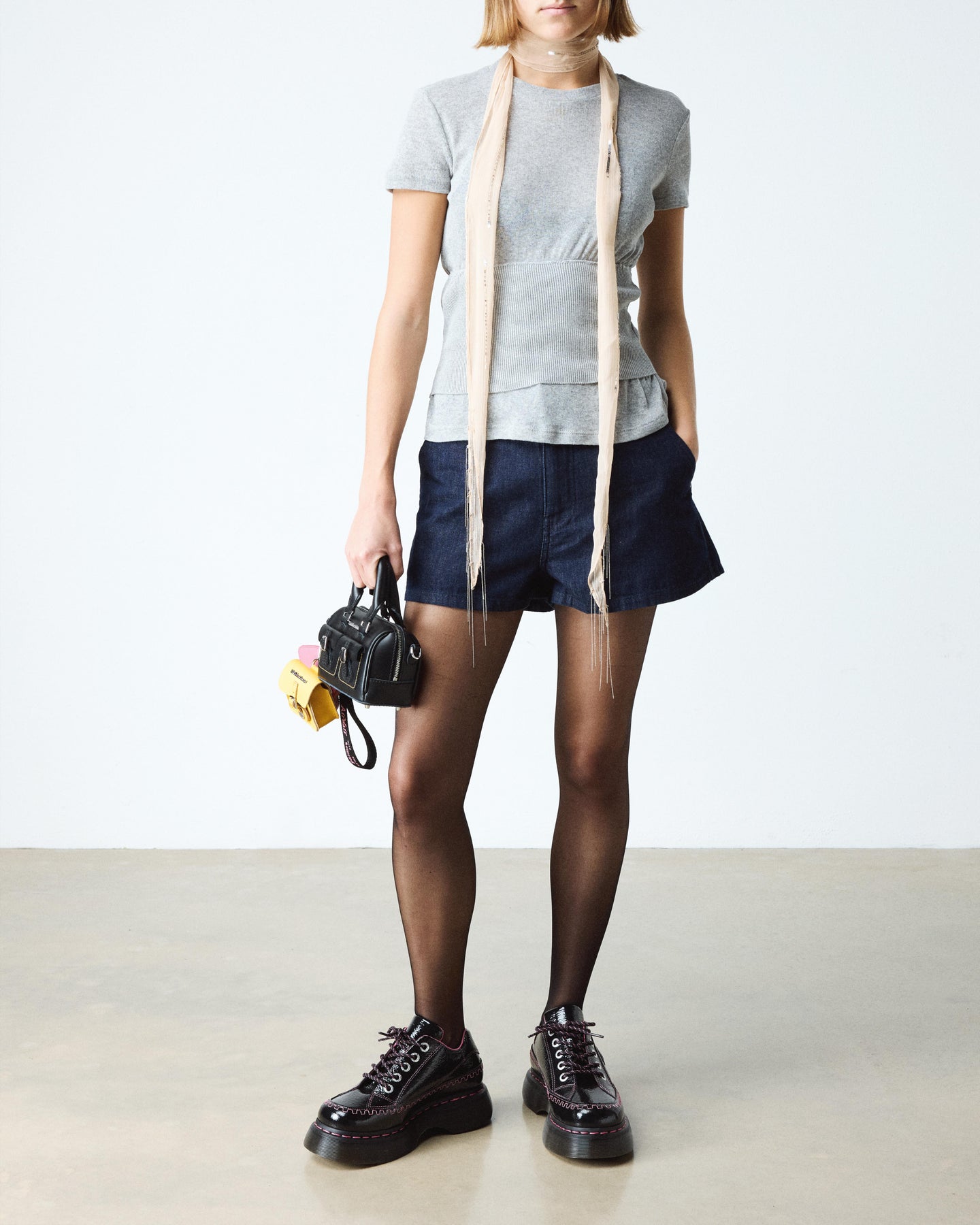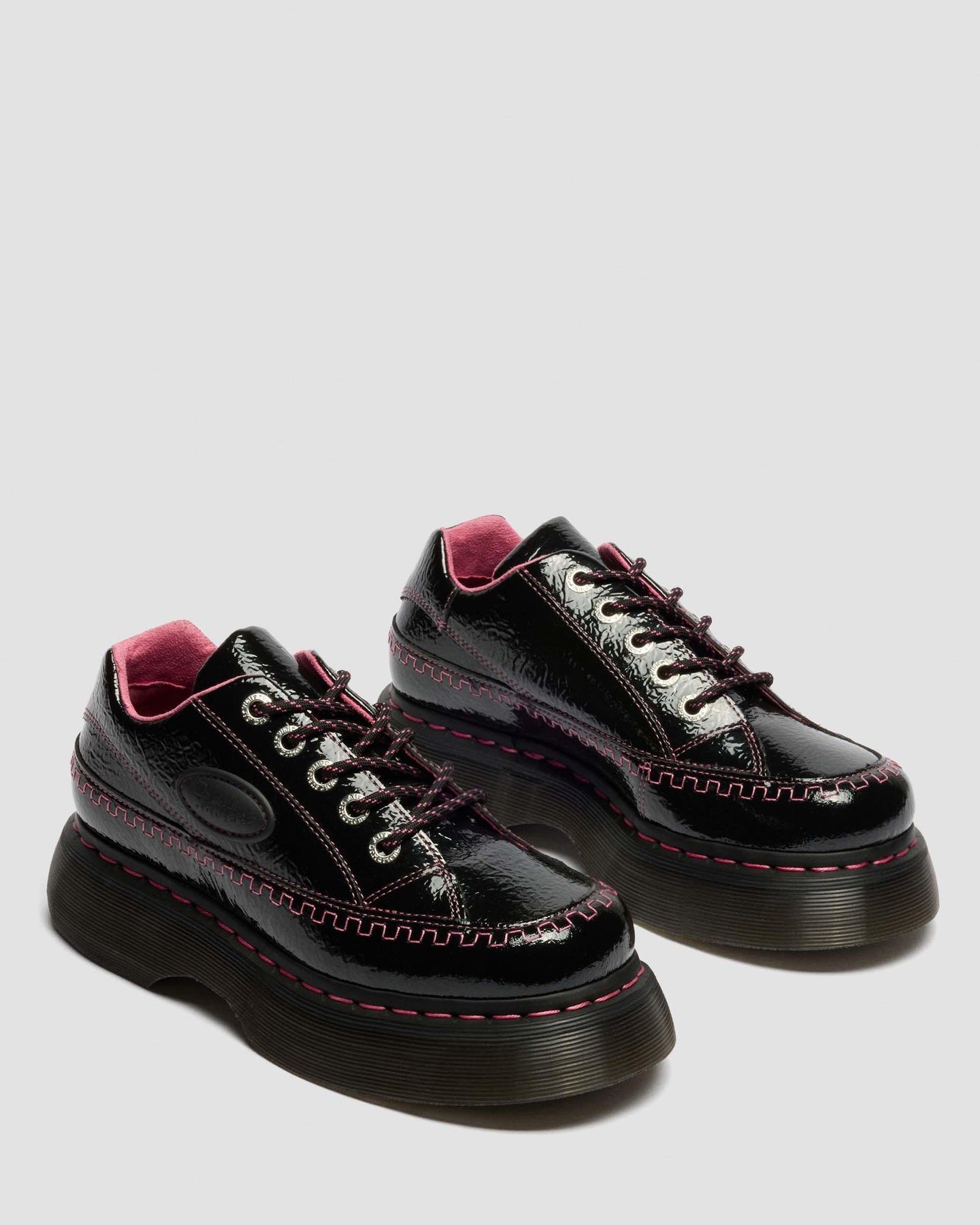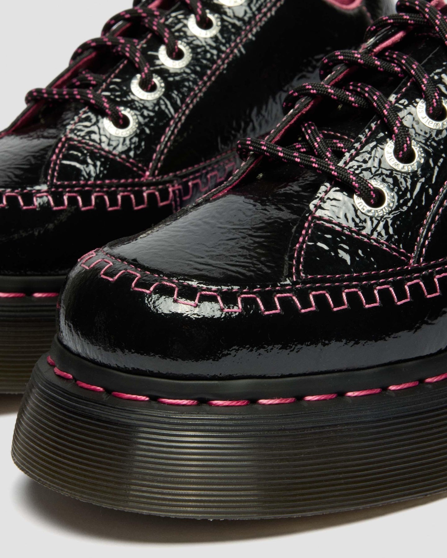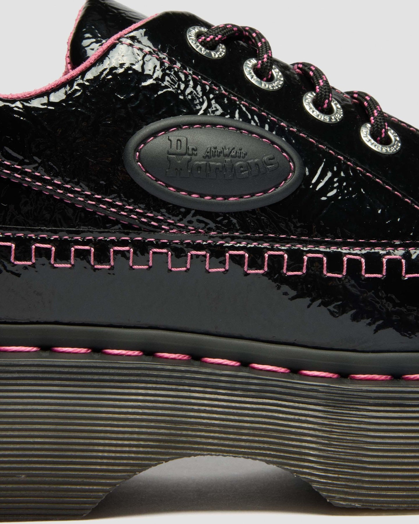 與Buzz一同掀起風潮。這款五孔鞋絕非隨波逐流之作。黑色做舊漆皮鞋面搭配黑粉雙色鞋帶,銀色五金配件與從鞋底包邊延伸至鞋眼的俏皮粉色車線,處處呼應九零年代的叛逆態度。厚實桶形邊緣的Buzz鞋底賦予穩健步伐,鞋底刻有DM經典溝槽紋路,並暗藏葉片圖案。