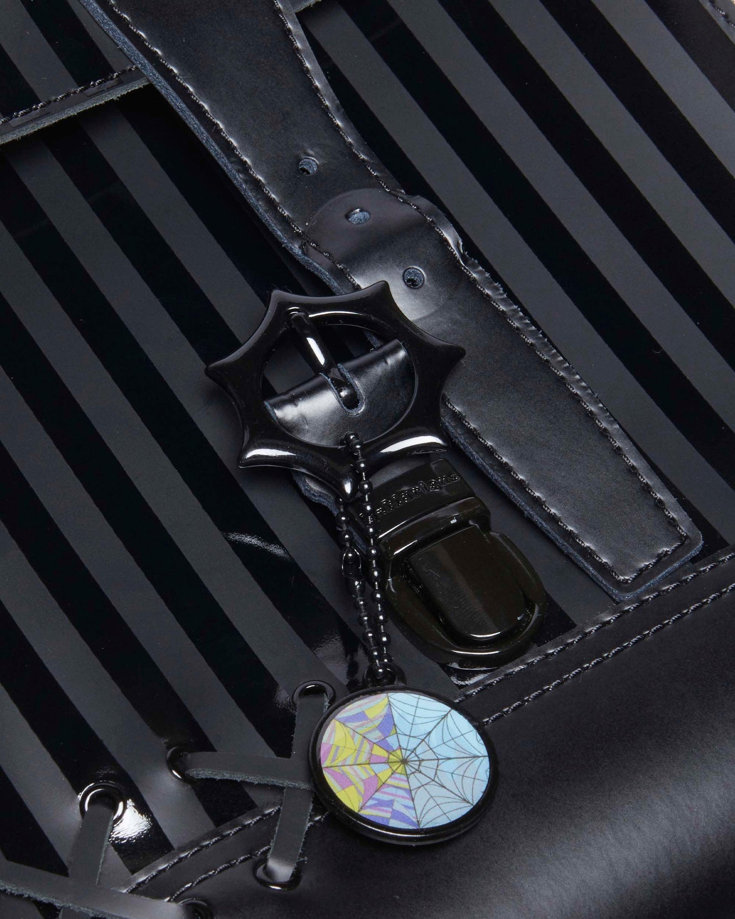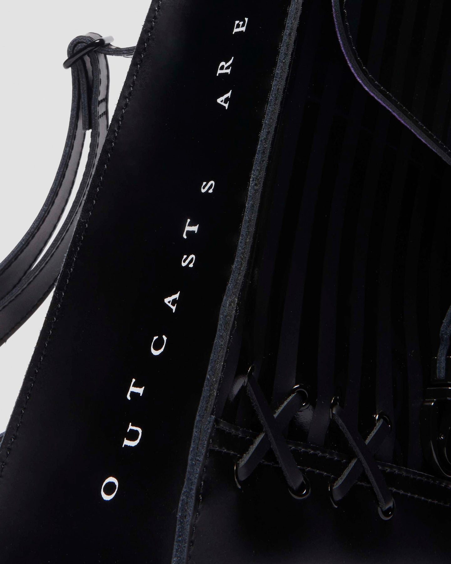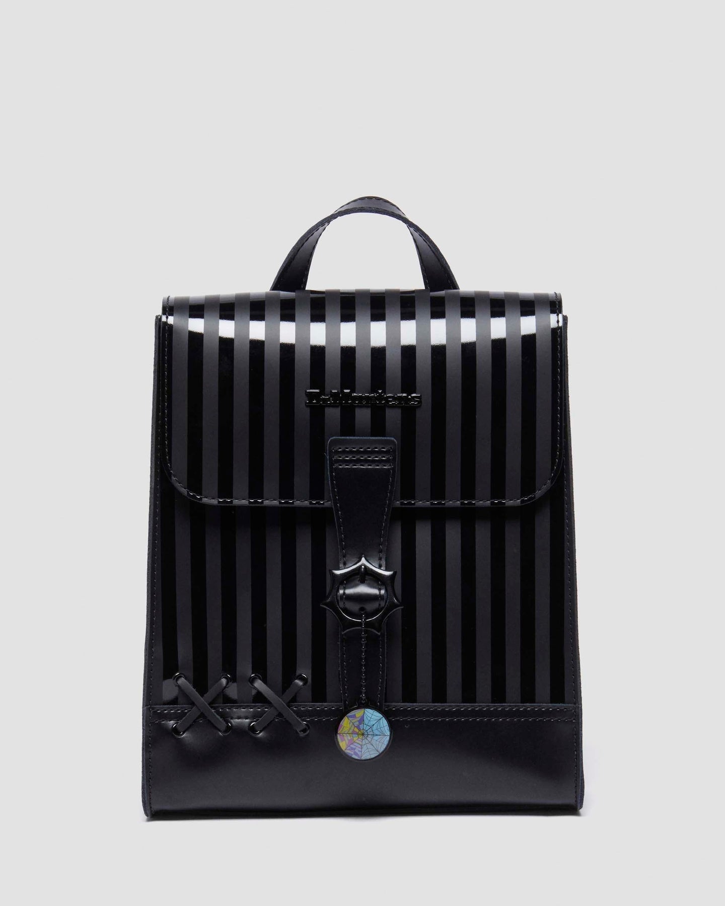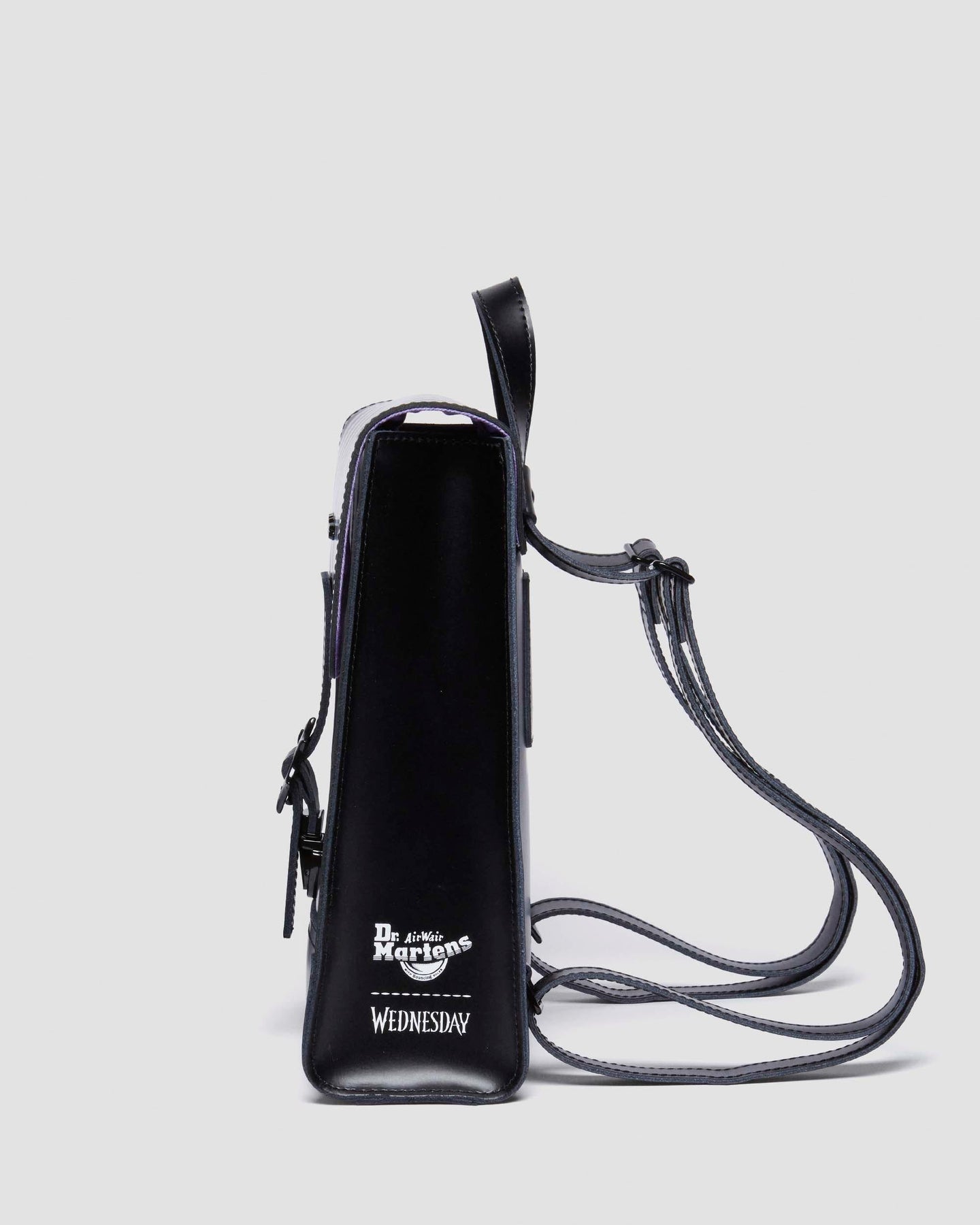 這款限量版迷你背包 DM's x Wednesday 合作系列,採用 Smooth 和 Kiev 皮革製成,正面和翻蓋上有亮光條紋。背包細節以 Wednesday 為靈感,包括皮革蕾絲細節、蜘蛛網特色搭扣,以及 Wednesday 和 Enid 臥室彩繪玻璃窗的可拆卸吊飾。側邊印有「OUTCASTS ARE IN」的白色文字,紫色襯裡則印有 Nevermore 學院的標誌。
