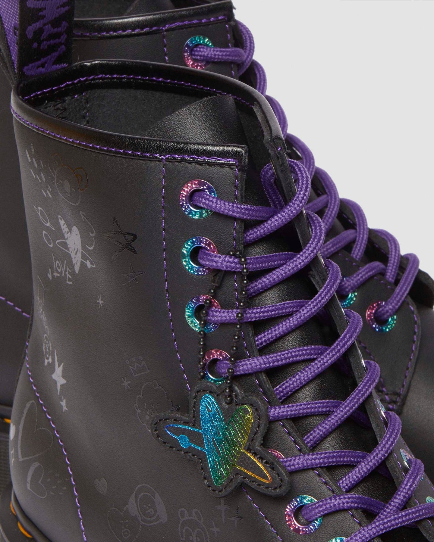 在我們與 BT21 Universe 的最新合作中表現自我。在 1460 靴子柔軟的 Nappa 皮革上,綴以俏皮的人物和插圖。鞋後帶上的彩虹印花「UNIVERSTAR」和彩虹色五金配件是亮點。每對鞋款皆附有 2 組紫色與黑色鞋帶,以及插圖鞋帶吊飾,最後還搭配限量版紫色 AirWair 鞋跟環,內藏心形飾釘。鞋底為著名的耐磨 DMS 外底,縫有黃色縫線。