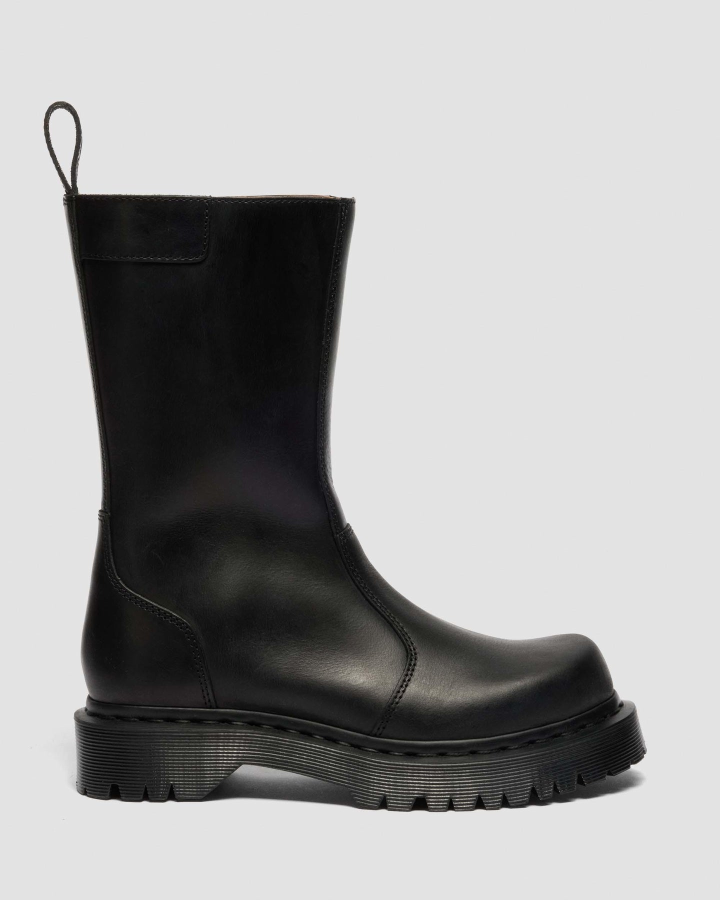 DM靴款的嶄新視角。Rejena系列巧妙收斂圓頭設計,打造流暢新廓形。選用黑色老式馬具皮革精工製作,配以黑色皮革後跟環。高筒踝靴配備全長拉鍊,穿脫自如。搭載加高版黑色Bex鞋底,搭配同色滾邊縫線。